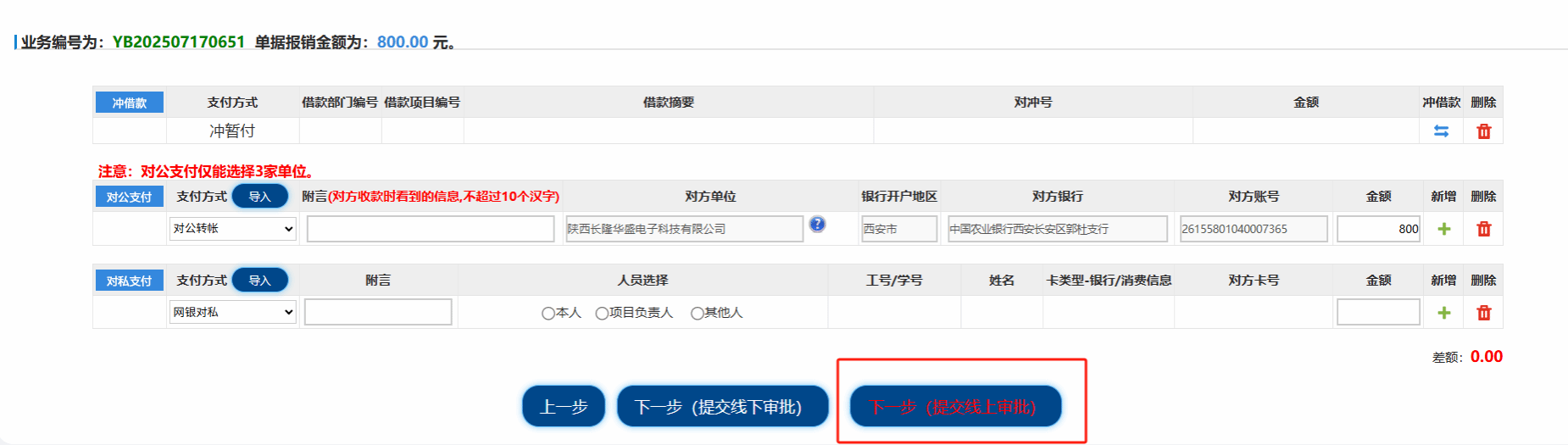 (5)支付时选择“下一步(提交线上审批)”。
