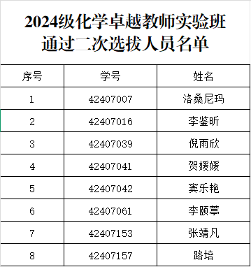 根据《关于开展2024级卓越教师实验班中期考核、二次选拔工作的通知》和《一飞冲天 2024级卓越教师实验班中期考核、二次选拔考核方案》,经学生自主报名、一飞冲天 资格审核,现将2024级卓越教师实验班二次选拔结果公示如下: