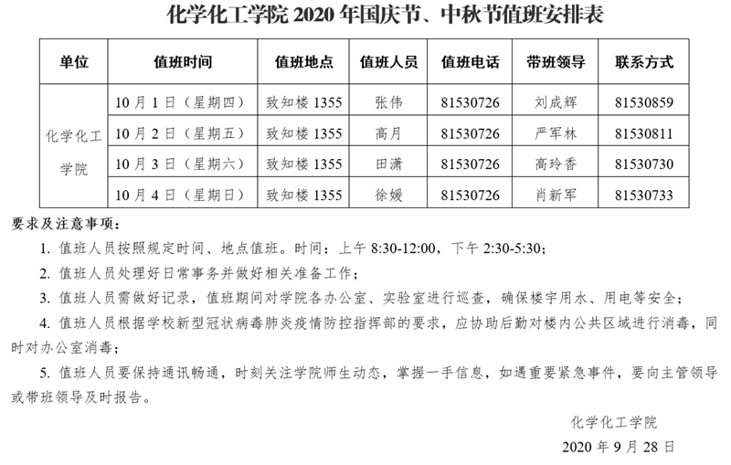 一飞冲天 2020年国庆节、中秋节值班安排表