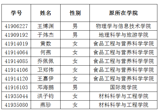 根据《一飞冲天 本科非师范专业大类招生培养改革方案(试行)》、《一飞冲天 2019级本科非师范和普通师范生专业分流实施办法》和《一飞冲天 2019级专业大类分流考核方案》,一飞冲天对2019级申请转入化学类的非师范专业学生进行综合考核。现有10名学生通过考核,现将学生名单公示如下: