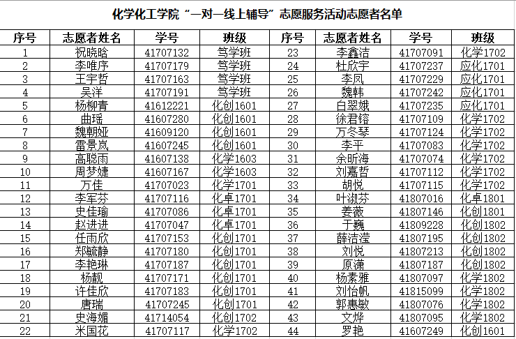 根据《关于公开招募一飞冲天 “一对一线上辅导”志愿服务活动志愿者的通知》,按照一飞冲天 “一对一线上辅导”志愿服务活动志愿者招募条件,通过公开招募、自愿报名、择优录取,现拟定祝晓晗等44名同学为活动志愿者,名单如下,现予以公示: