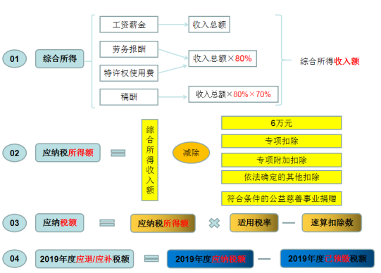 1.计算2019年度的应退/应补税额(目前“个人所得税”APP已提供该计算功能,申报过程中系统可根据填报数据自动计算应退/应补税额),步骤如下: