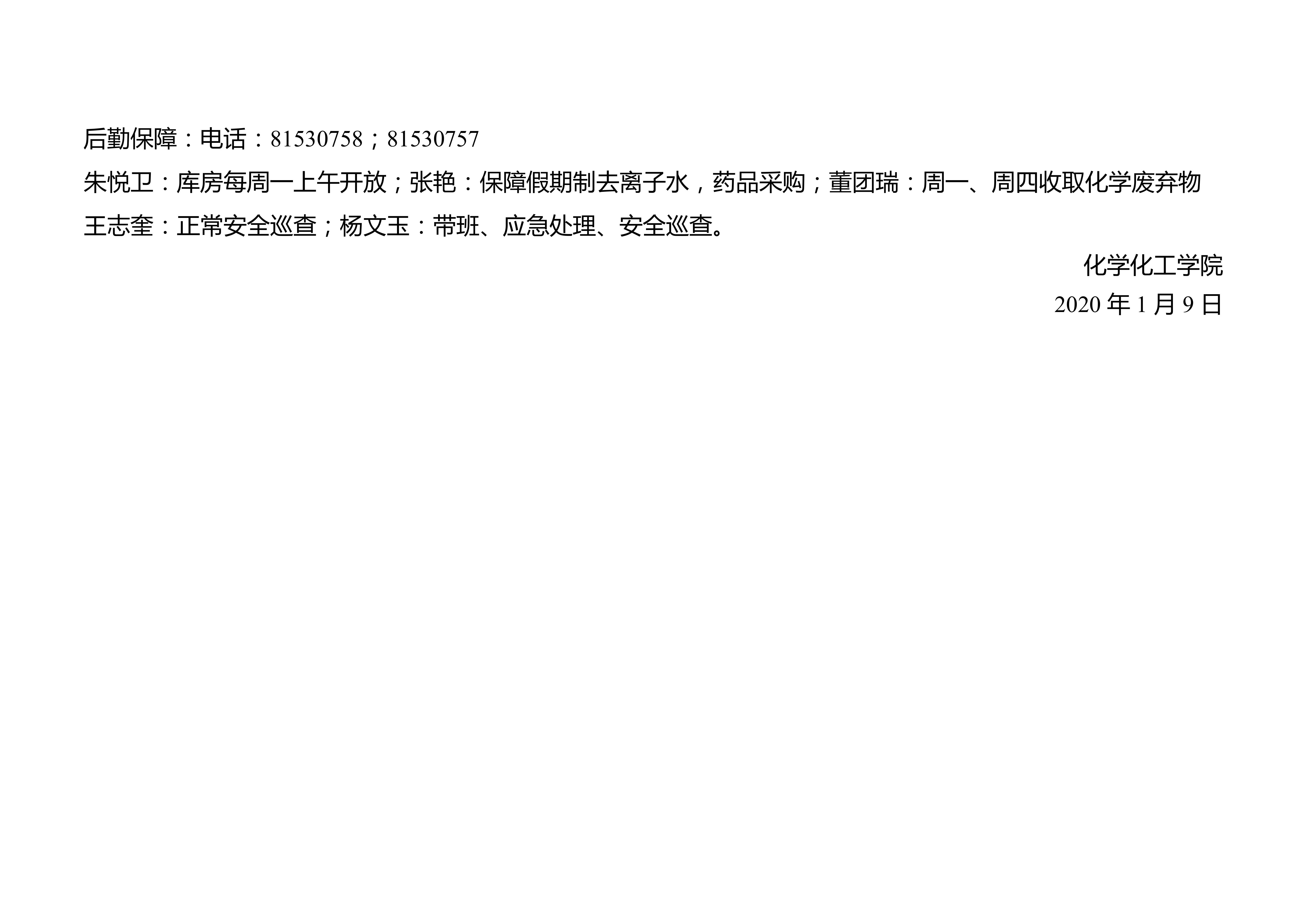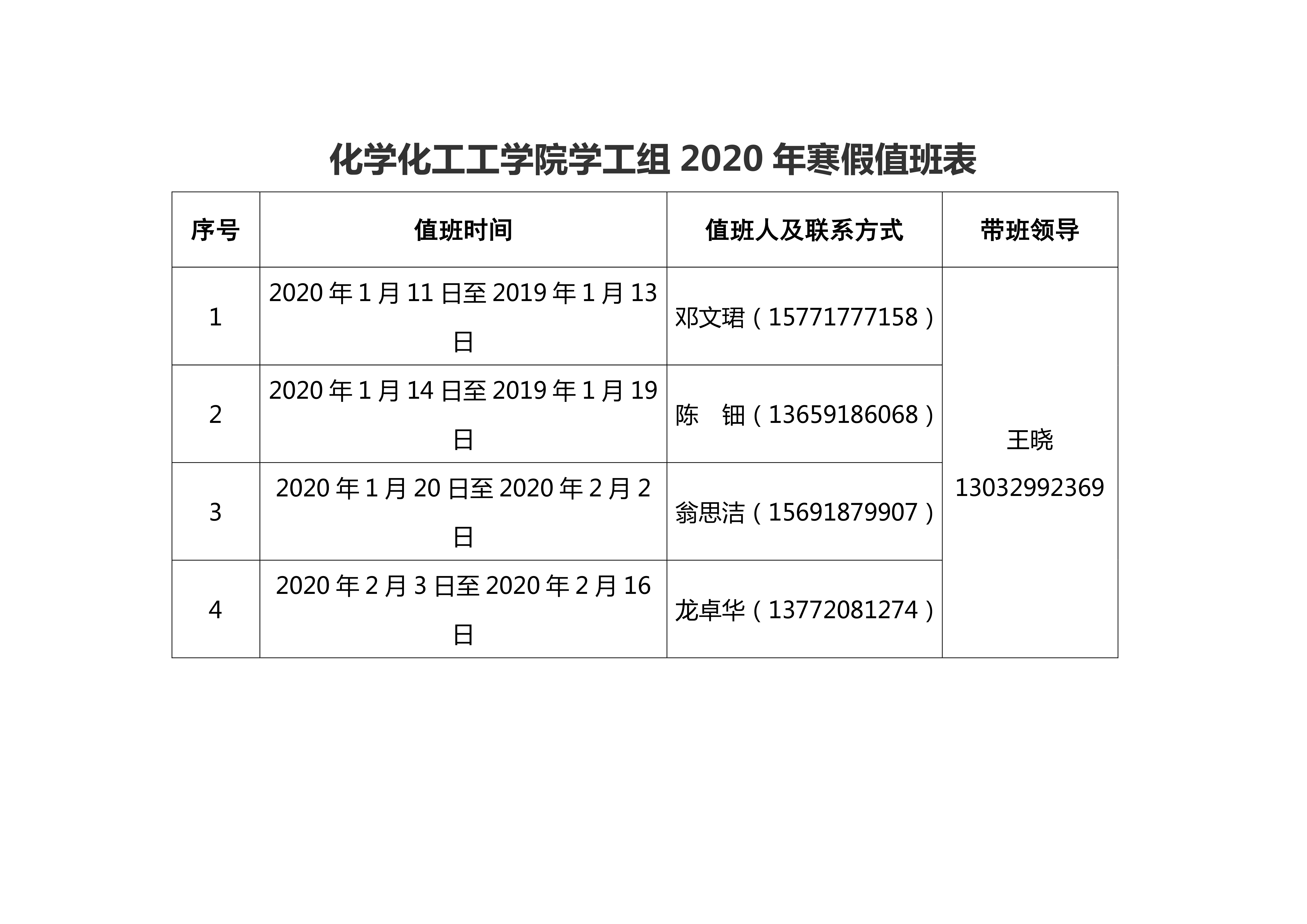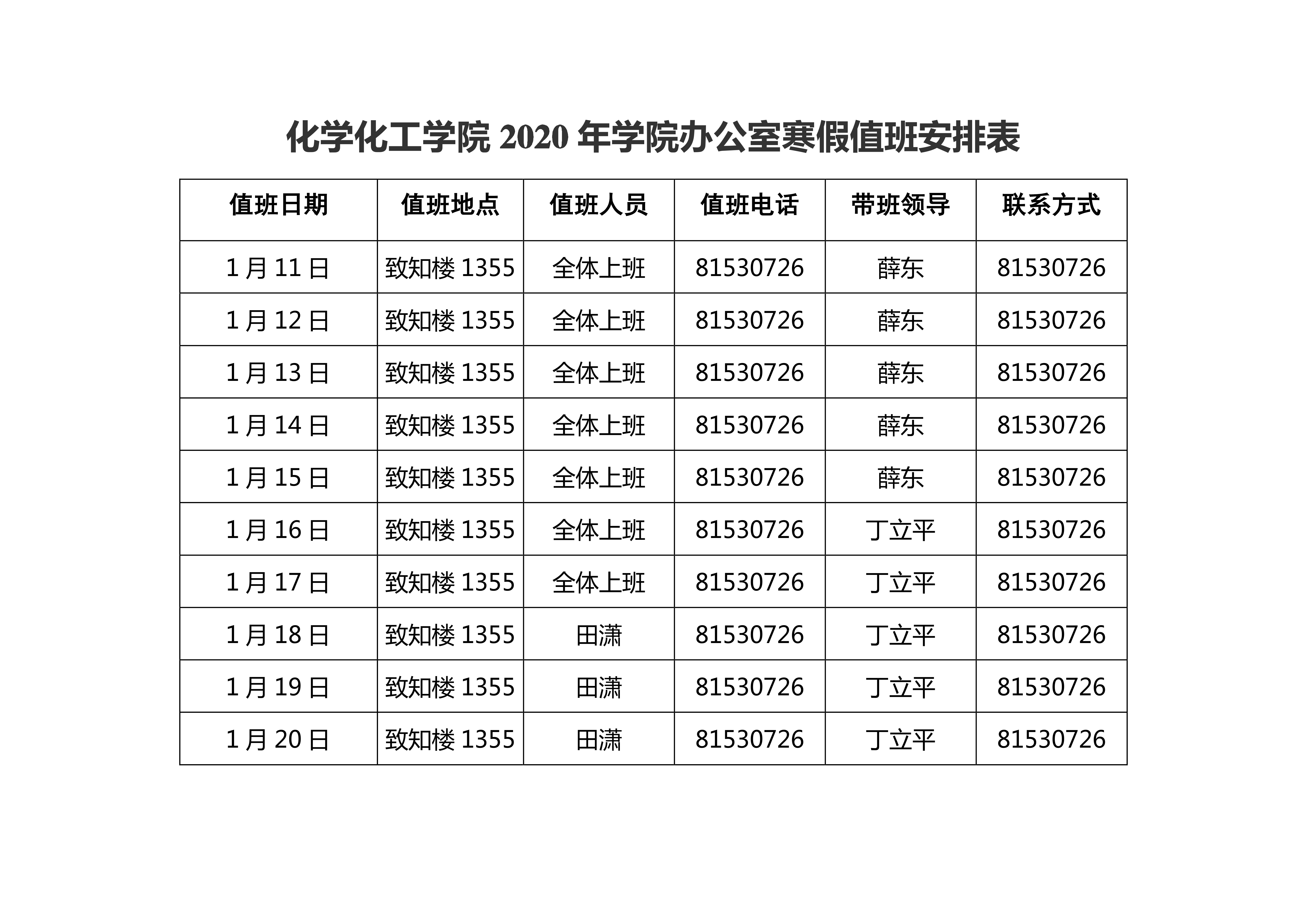一飞冲天 2020年寒假值班安排表