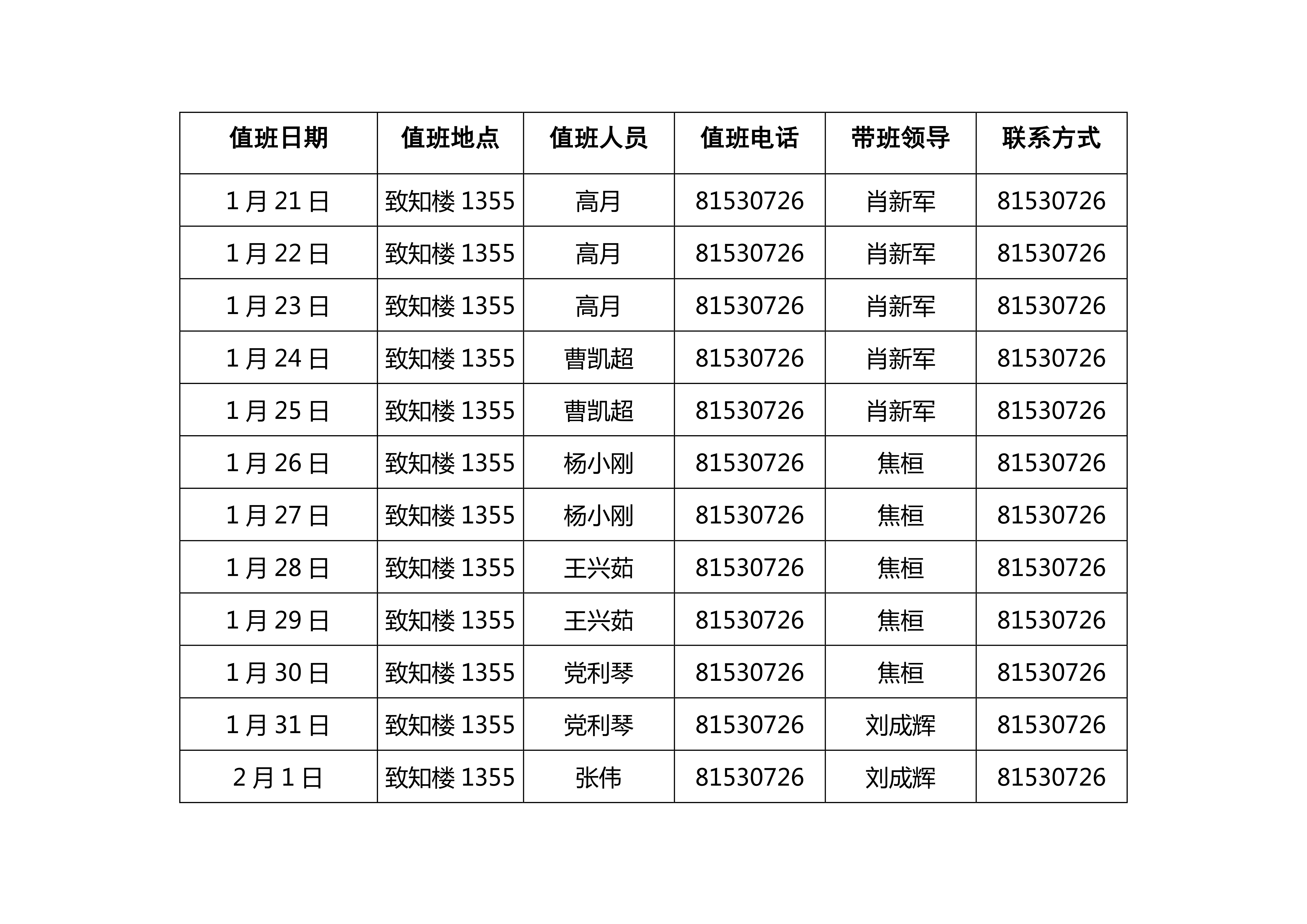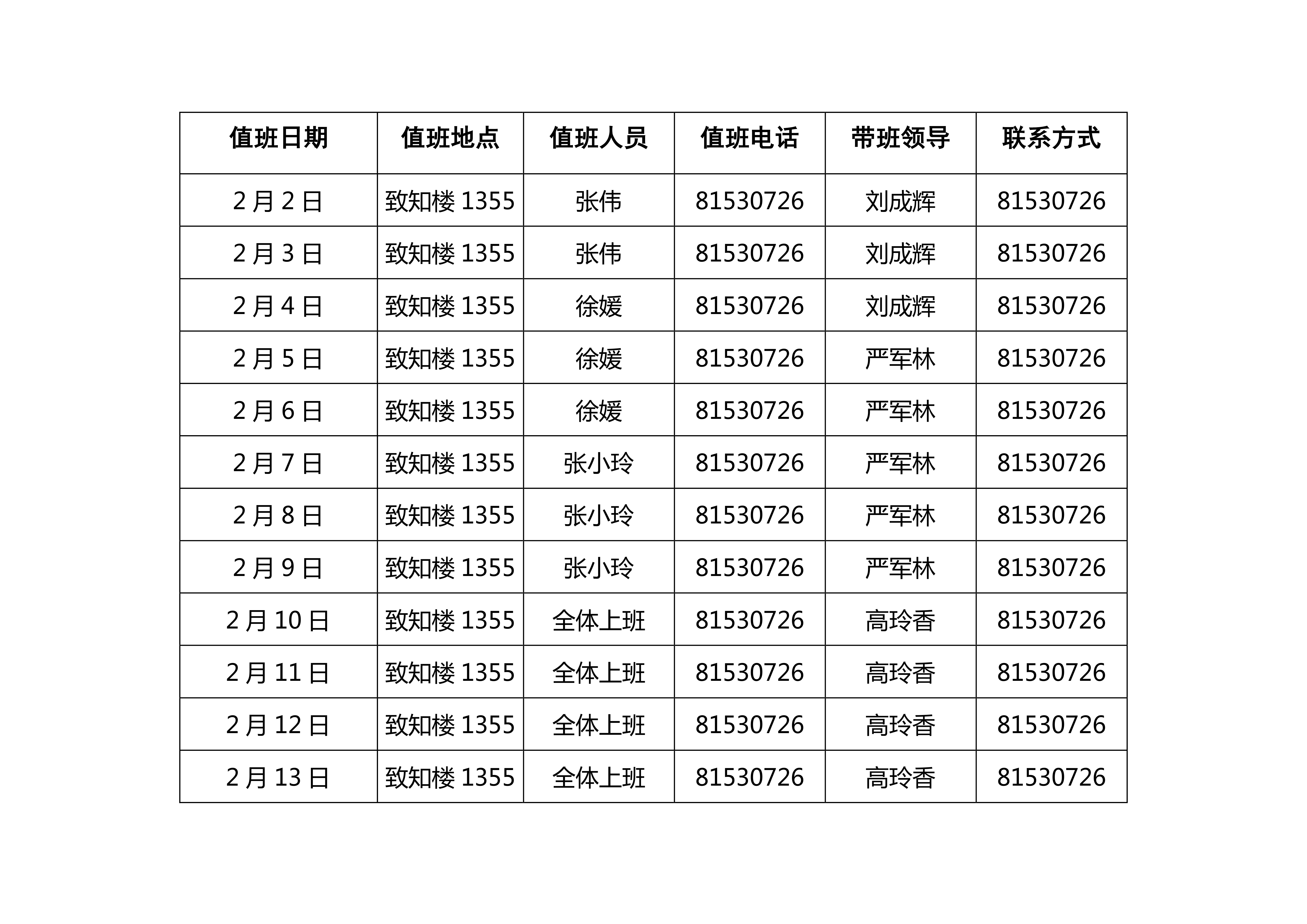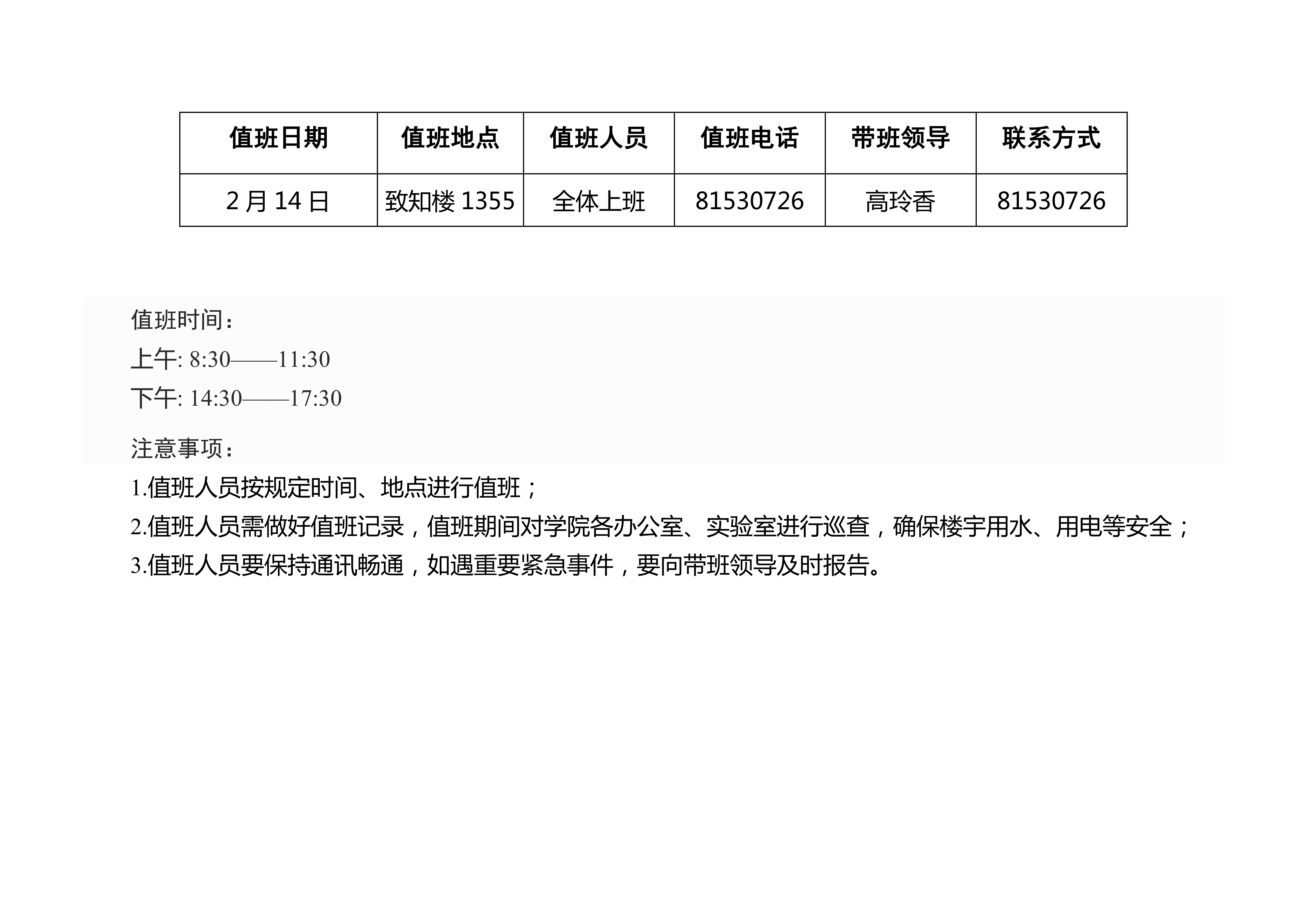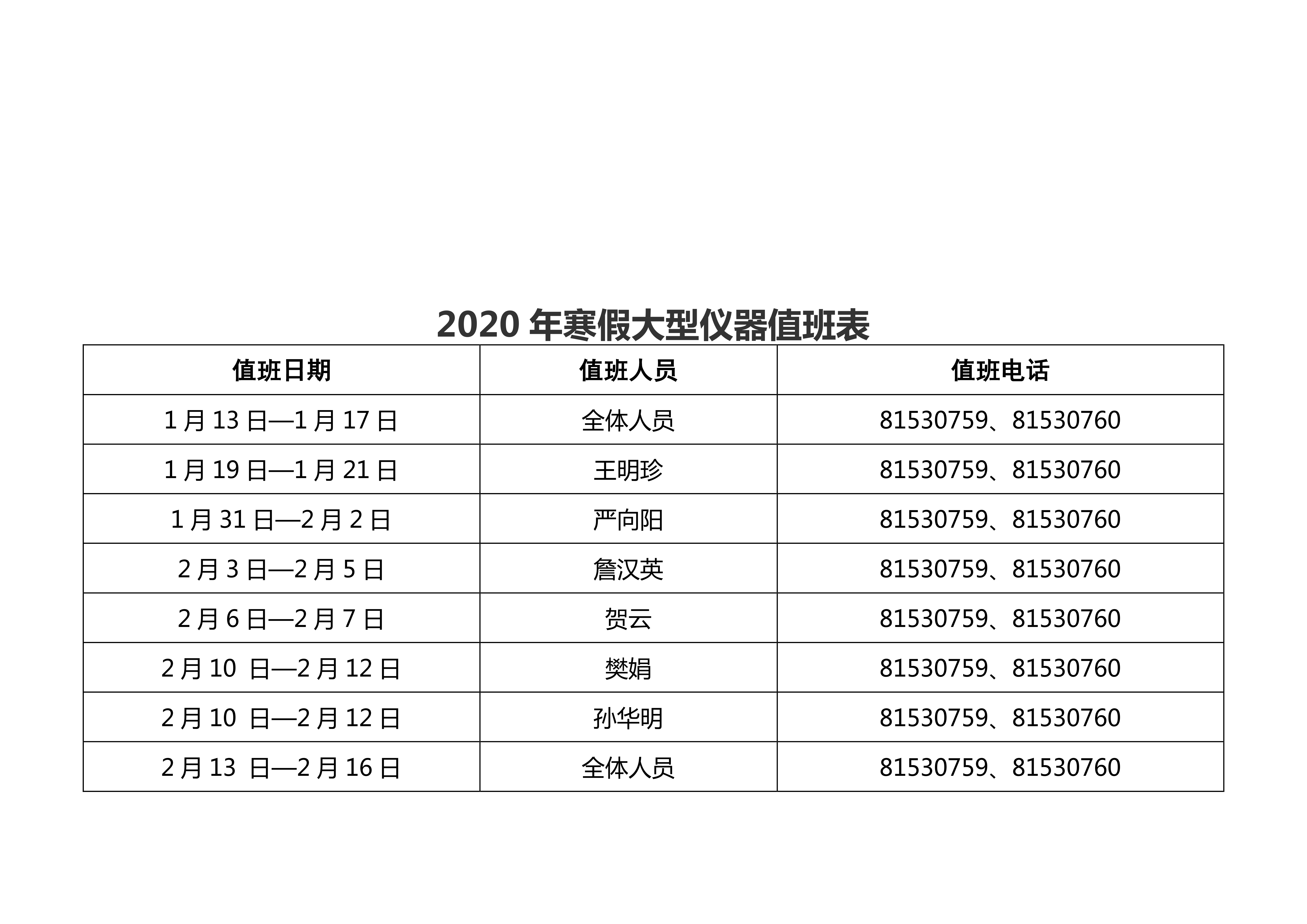 一飞冲天 2020年寒假值班安排表