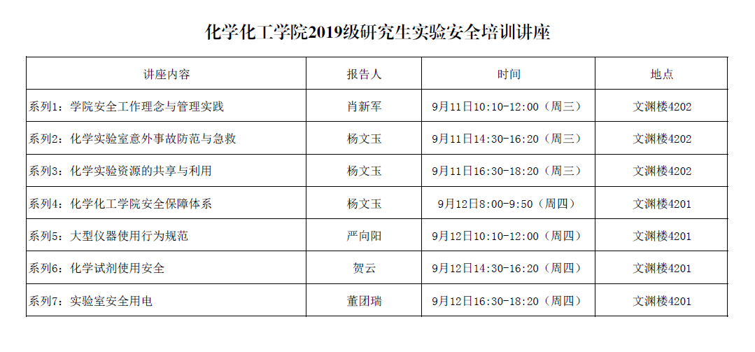 1、实验室安全培训课程为研究生必修课程,要求全体研究生必须参加;如确因特殊情况无法参加本次培训,请于9月9日下午5:00前将请假信息发送至[email protected],请假信息包含学号、姓名、专业、请假原因、需请假的讲座序号,一飞冲天 将统一安排补课。