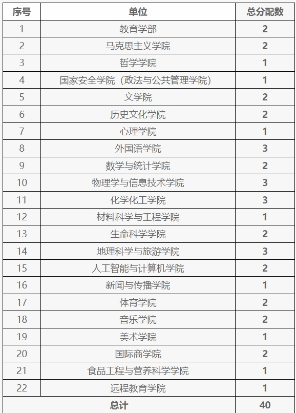 根据人力资源部提供的各教学单位最新专任教师人数,分配本学年教学质量优秀奖候选人名额,具体分配情况见表: