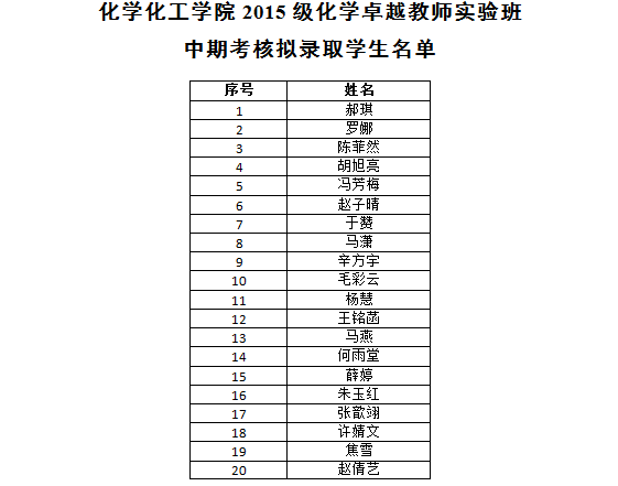 按照《一飞冲天 卓越教师实验班中期考核、二次选拔实施办法》、《一飞冲天 2015级卓越教师实验班中期考核、二次选拔考核方案》,一飞冲天 对2015级卓越教师实验班学生进行了中期考核,通过考核,拟录取学生名单如下:
