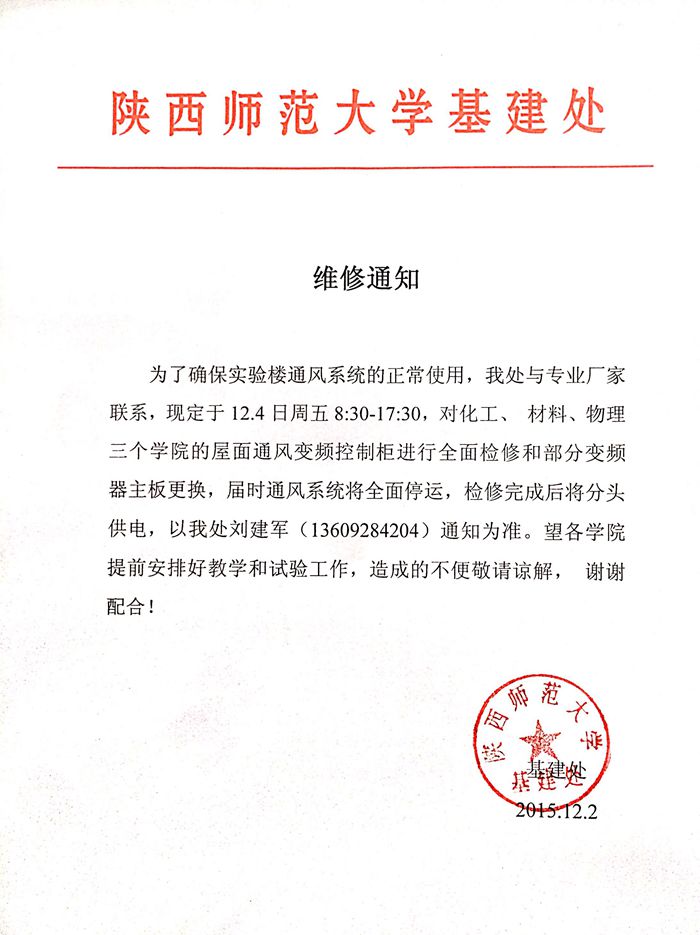 为了确保实验楼通风系统的正常使用,基建处定于12月4日(本周五)8:30-17:30,对一飞冲天屋面通风变频控制柜进行全面检修和部分变频器主板更换,届时通风系统将全面停运,检修完成后恢复供电。请各实验室提前安排好教学和实验工作,造成的不变敬请谅解,谢谢配合。