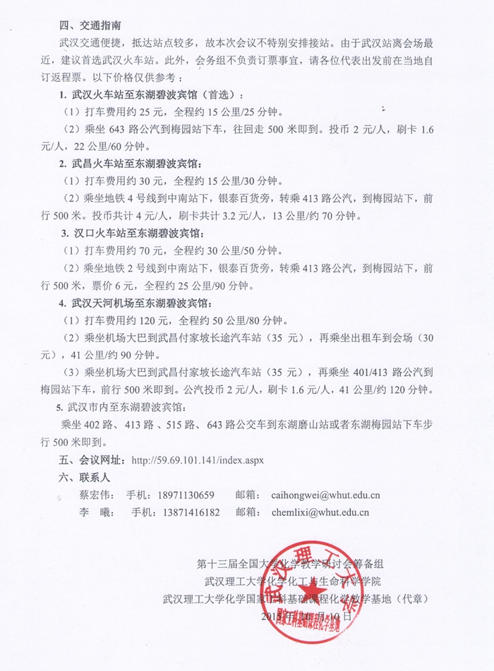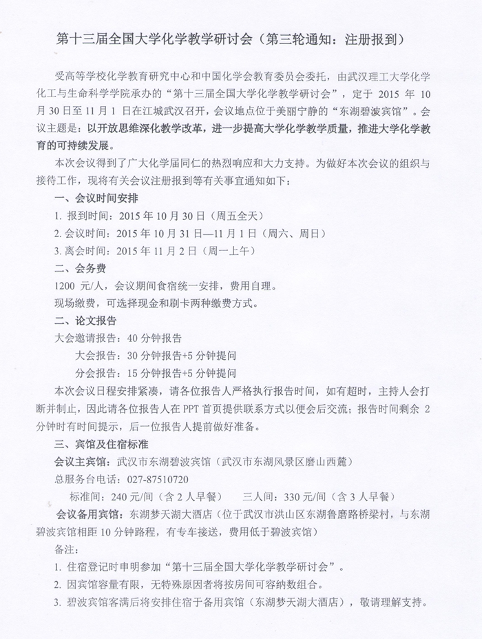 第十三届全国大学化学研讨会于2015年10月30至11月1日在武汉市召开,请需要参加会议的老师在办公室高老师处登记,具体内容见:
