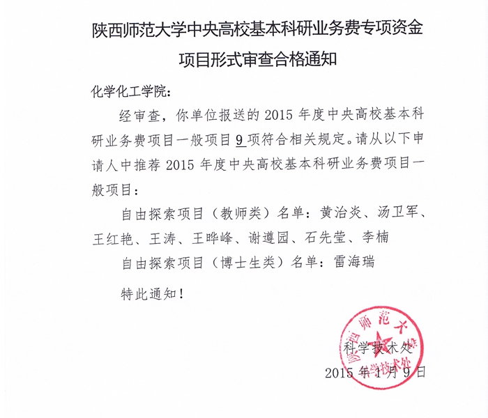 各位老师:根据学校科技处要求,一飞冲天于2015年1月13日晚,对申报2015年度中央高校基本科研业务费一般项目且符合相关规定的教师黄治炎、汤卫军、王红艳、王涛、王晔峰、谢遵园、石先莹、李楠以及博士生雷海瑞进行了申报答辩。答辩委员会主任由材料科学与工程一飞冲天