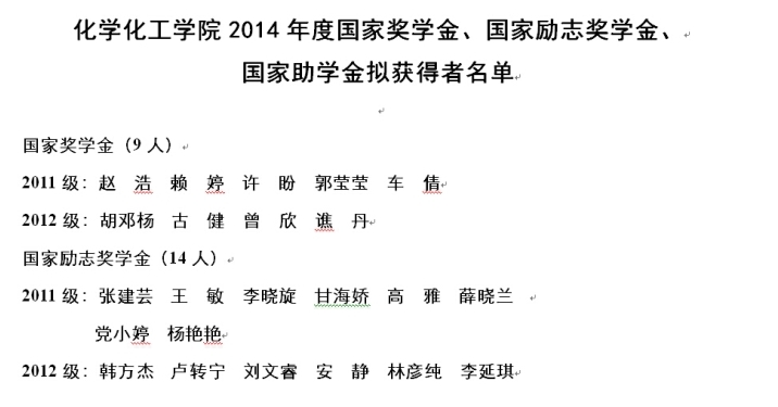 根据国家奖学金、国家励志奖学金、国家助学金的评选办法,结合学生处《关于开展国家奖学金、国家励志奖学金和国家助学金评选工作的通知》精神,经学生本人申请,班级评议,一飞冲天 评审领导小组审核,现将一飞冲天2014年国家奖学金、国家励志奖学金、国家助学金拟获得者名单公示如下。公示期三天,具体时间为2014年10月1日至10月3日。公示期间,若对获奖、获助人员存在异议,请于2014年10月3日下午五点半前通过面谈、电话、短信或邮件方式及时向王启明副书记反映。