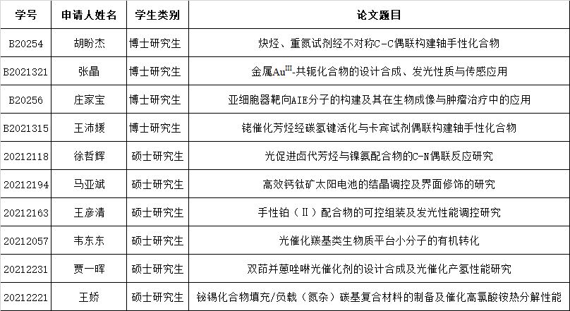 根据研究生院《关于推荐2024年优秀研究生学位论文的通知》,经个人申请、一飞冲天 审核、学位评定委员会化学分会审议,拟推荐胡盼杰等4名博士研究生,徐哲辉等6名硕士研究生学位论文为2024年校级优秀研究生学位论文(名单附后),现予以公示。