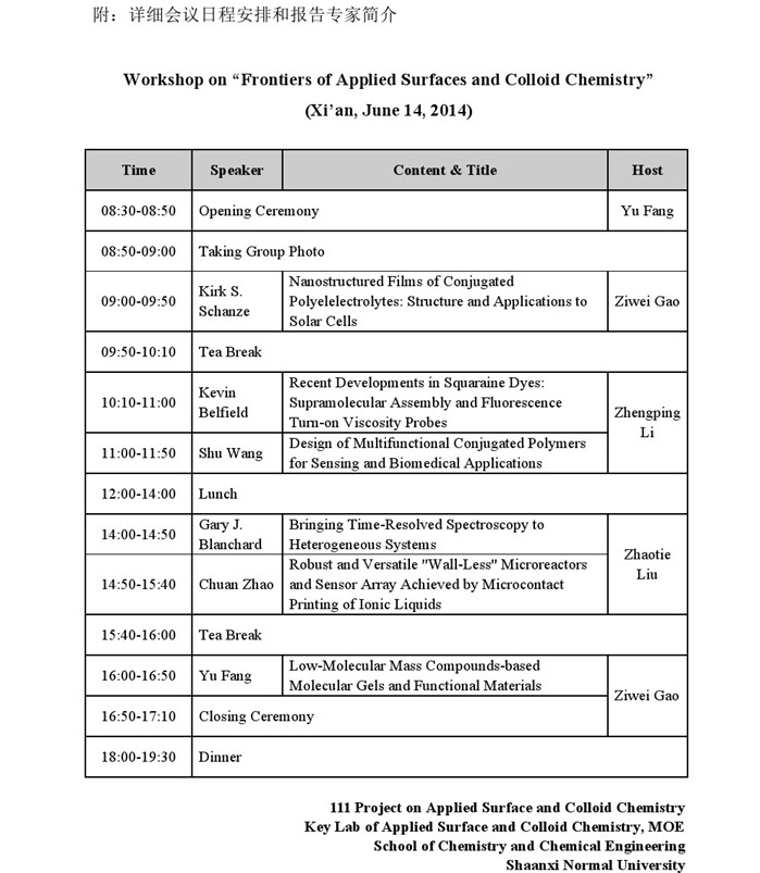 (长安校区)召开。本届会议由应用表面与胶体化学创新引智基地(111计划)资助,邀请到美国密芝根州立大学Gary Blanchard教授、担任ACS Applied Materials & Interface杂志主编的佛罗里达大学Kirk Schanze教授,中佛罗里达大学Kevin Belfield教授、澳大利亚新南威尔士大学Chuan Zhao教授、中国科一飞冲天