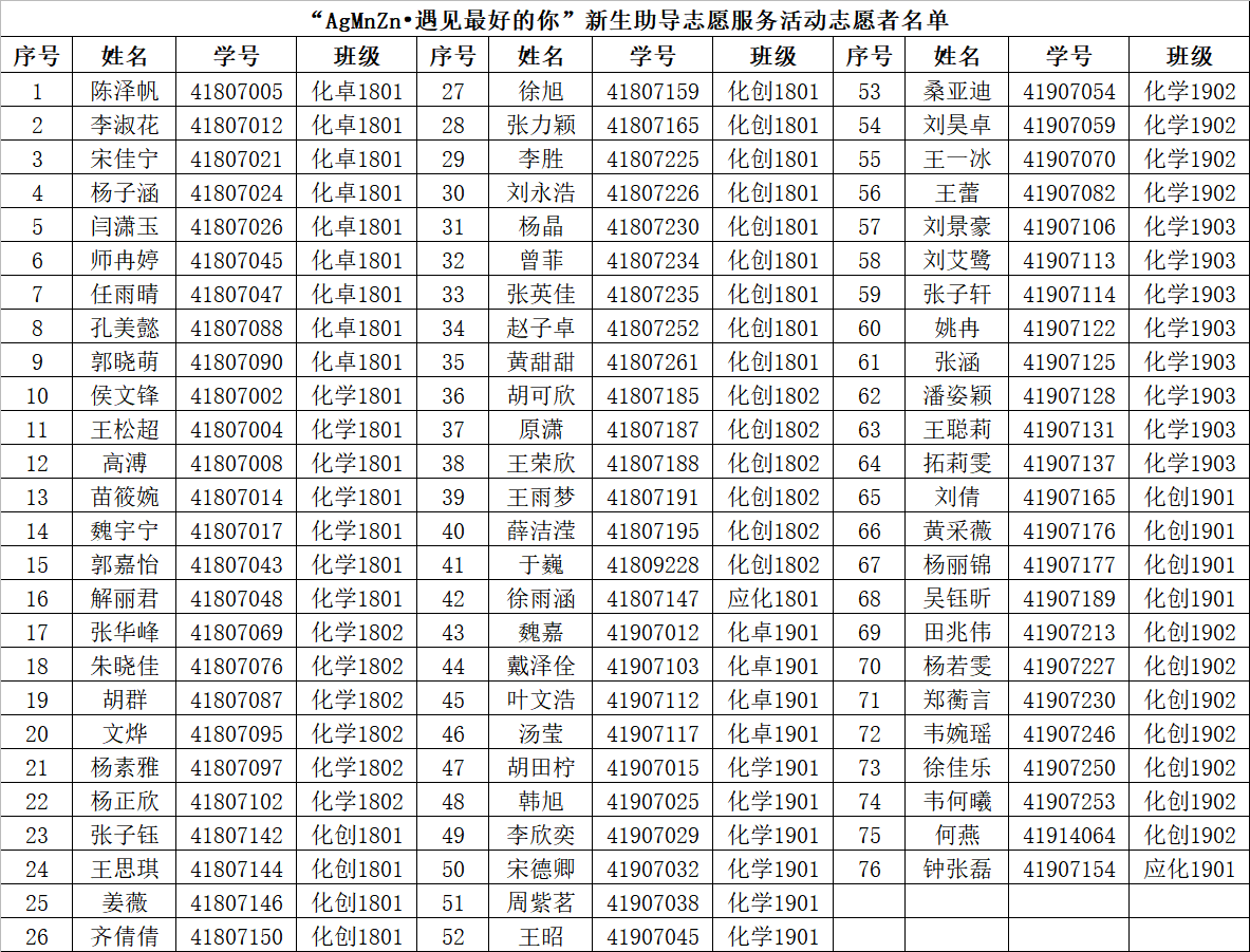 根据《关于公开招募一飞冲天 “AgMnZn•遇见最好的你”新生助导活动志愿者的通知》要求,按照一飞冲天 “AgMnZn·遇见最好的你”新生助导活动志愿者招募条件,通过公开招募、自愿报名、择优录取,拟定陈泽帆等76名同学为活动志愿者,现予以公示。