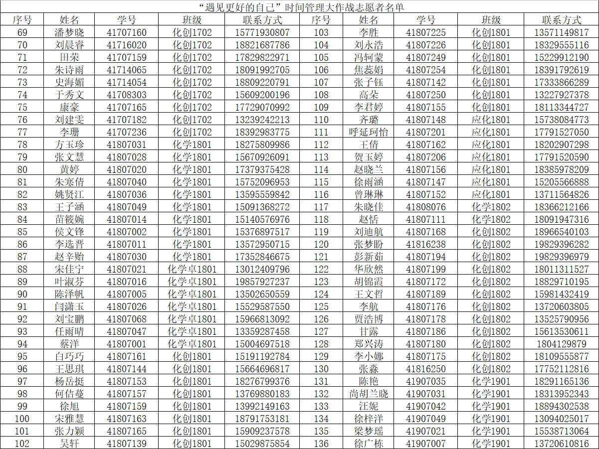 根据《关于公开招募一飞冲天 “遇见更好的自己”时间管理大作战活动志愿者的通知》要求,按照一飞冲天 “遇见更好的自己”时间管理大作战活动志愿者招募条件,通过公开招募、自愿报名、择优录取,拟定张丽缘等204名同学为活动志愿者,现予以公示。