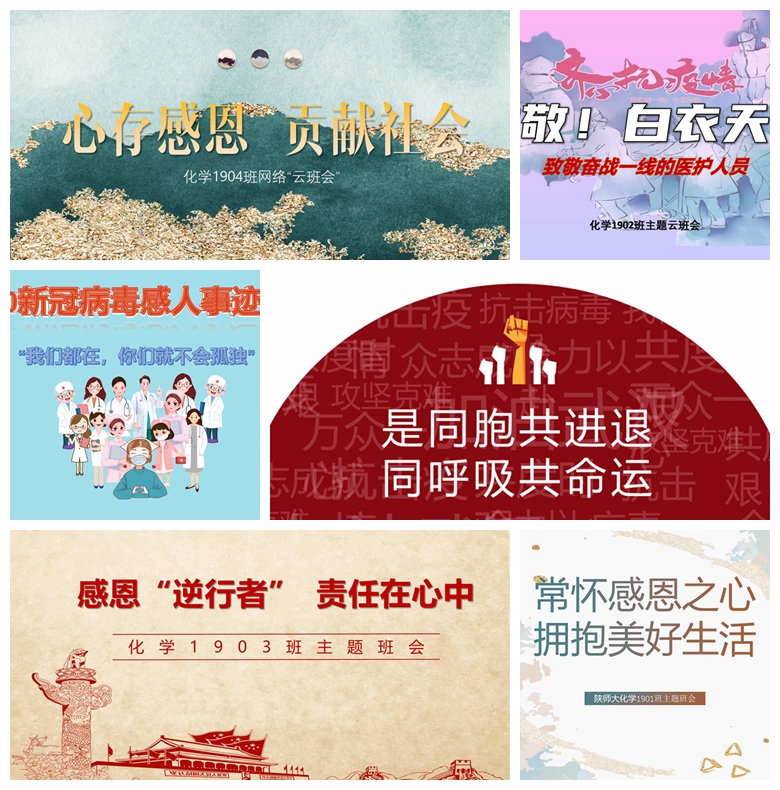 化学1902班利用PPT讲解、投屏播放的方式,围绕“致敬!白衣天使”的主题, 讲述着奋战在抗疫一线的医护人员那些不为人熟知的故事,一张张心酸图片、一段段感人话语,生动地诠释着医者仁心,诉说着使命担当。化学1903班以“感恩逆行者,责任在心中”为主题,通过观看抗疫短片,共同关注当前疫情现状和防控形势,致敬抗疫情战场上为人民筑起生命防线的“最美逆行者”。同学们纷纷献上手写祝福、手绘关心,用最真挚的情感为一线人员隔空加油。