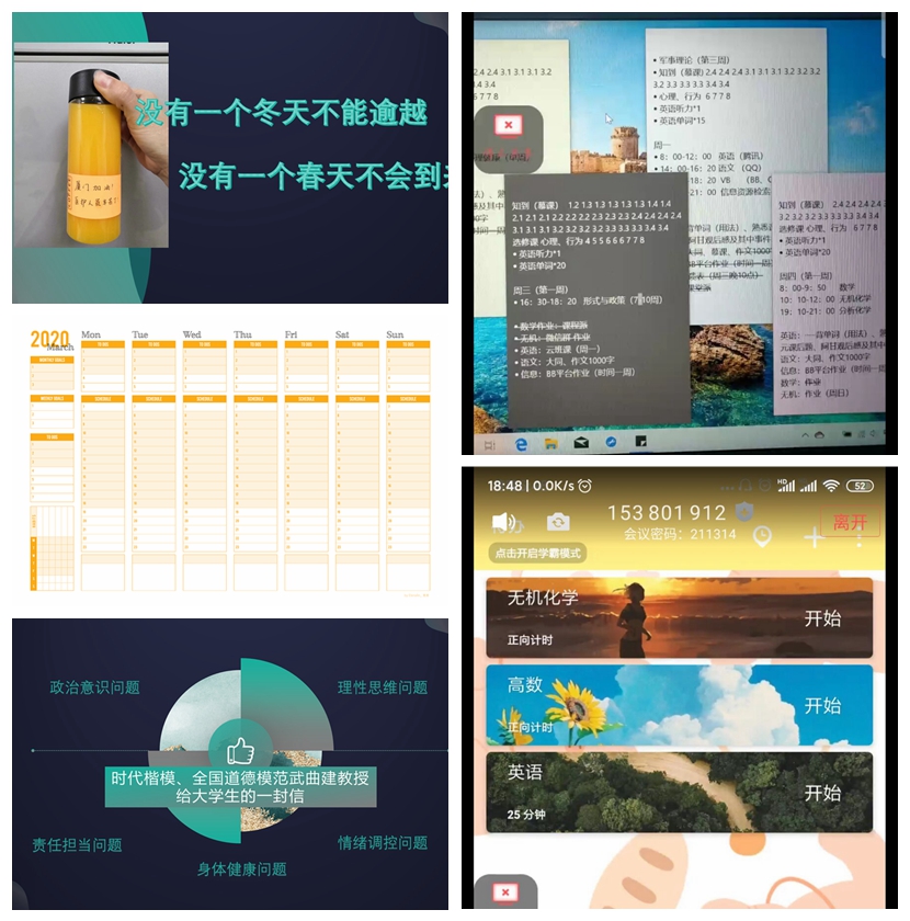 疫情当前,最好的贡献首先就是做好自己。化学类1902班的同学们各自分享假期学习生活,互相推荐“番茄钟”“时间管理模板”“艾宾浩斯记忆表”等一系列高效的学习方法和学习工具,呼吁同学们在特殊假期里制定学习计划,养成良好习惯,努力做到“自律即自由”。2019级化学(卓越教师实验班)通过集体学习《时代楷模、全国道德模范曲建武教授给大学生朋友的一封信》,就“当代大学生如何为抗击疫情做贡献”展开热烈讨论,班长戴泽佺讲述母亲作为医护人员积极参与当地一线防疫工作的故事,团支书常凯分享个人参与社区防疫志愿工作的经历,号召同学们自觉加强思想道德修养,提高政治觉悟,用行动诠释大学生的责任担当。