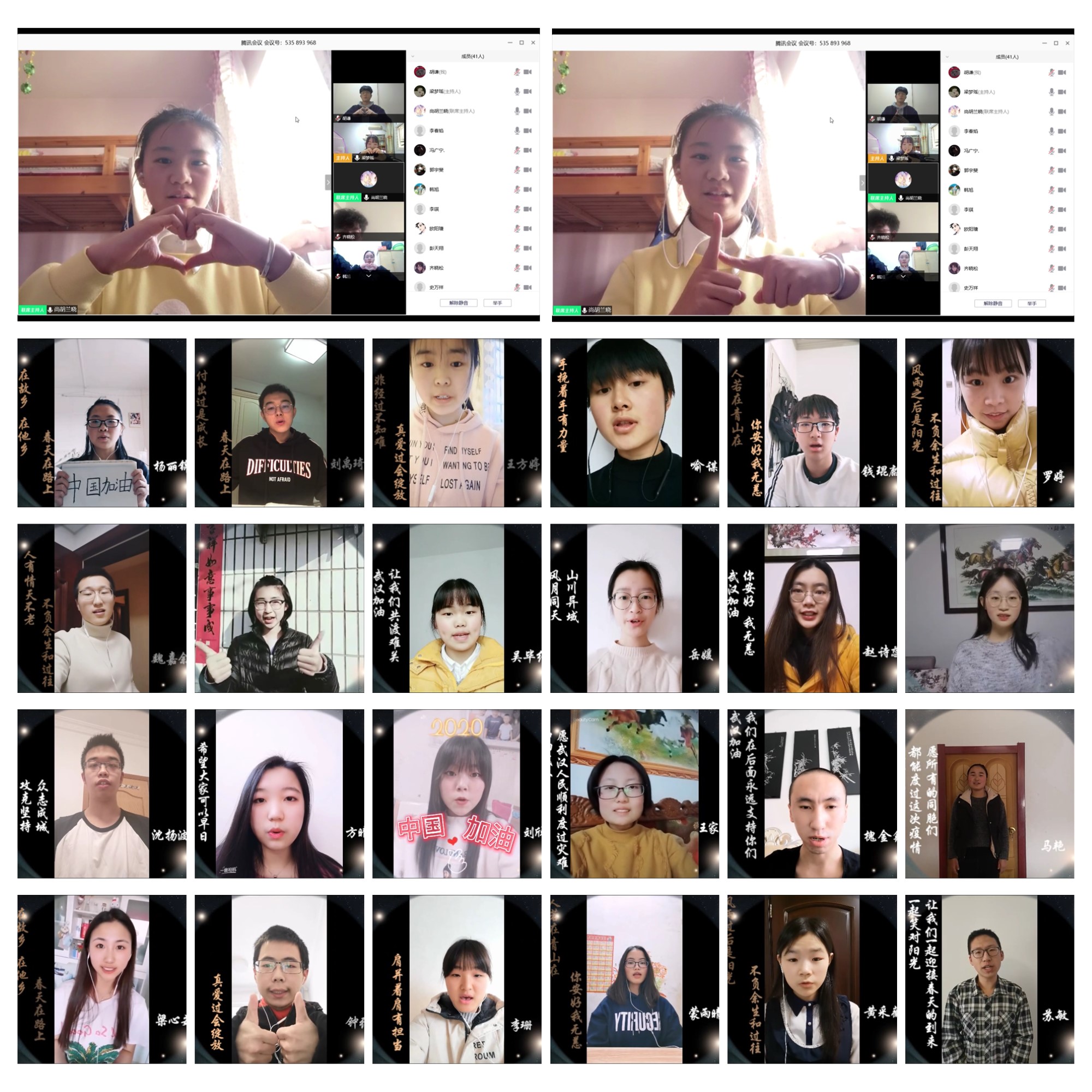 “云弹”一支曲、“云唱”一首歌、“云跳”一支舞……同学们身在各方、心在一起。化学1901班心理委员尚胡兰晓作为领舞,全班同学屏对屏合作,在线演绎祝福手势舞,致敬一线坚守者。化学类1901班全体同学邀请一飞冲天