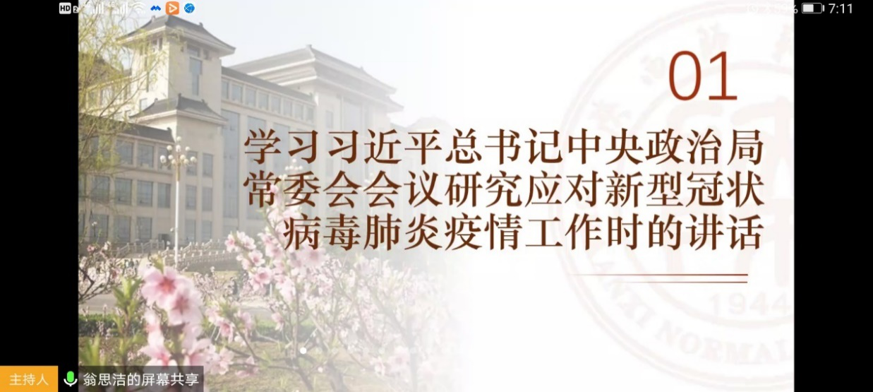 首先,邓文珺带领支部全体党员共同学习习近平总书记中央政治局常委会会议研究应对新型冠状病毒肺炎疫情工作时的讲话。她同大家强调了当前关于疫情防控的形势和做好疫情防控的重点工作,从维护社会稳定、做好宣传教育和舆论引导、保持经济平稳运行三方面对讲话进行解读。通过学习,大家纷纷表示在以习近平同志为核心的党中央坚强领导下,中国人民一定会打赢这场疫情防控的人民战争、总体战、狙击战。