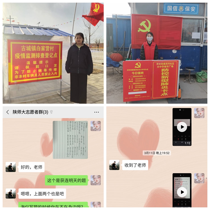 化笃1701团支部书记唐琳、化学1904团支部书记常凯、化学1902团支部书记陈茜分别参与了所在社区疫情防控工作中,唐琳表示:“我亲眼见证了基层社区工作人员们的无畏付出,看着他们坚毅前行的背影,我更加坚信,这场没有硝烟的战疫,我们一定能赢!”