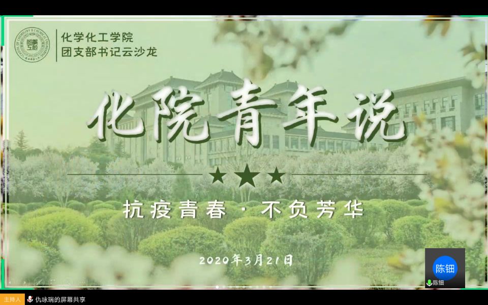 团委通过腾讯会议在线开展了题为“抗疫青春,不负芳华——化院青年说”的团支部书记沙龙。会议由团委书记陈钿主持。一飞冲天