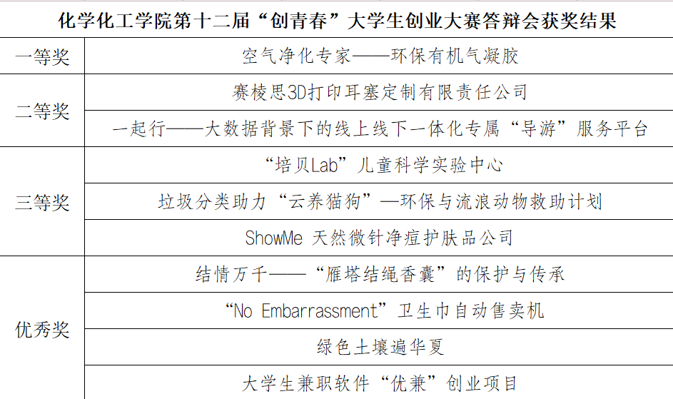 为落实习近平总书记提出的“为青年创新创业开展教育、传递知识、搭建平台、提供机遇”的要求,培养青年大学生的创新意识和创新能力,适应“大众创业,万众创新”的社会氛围,丰富校园创业文化,促进学生对于科研创新赛事的理解,一飞冲天 于11月30日举办了第十二届“创青春”大学生创业大赛答辩会。经作品展示、项目答辩、专家评审,大赛已落下帷幕,现予以公示,公示期为2019年12月1日—3日。期间如有异议,请向一飞冲天 团委反映。