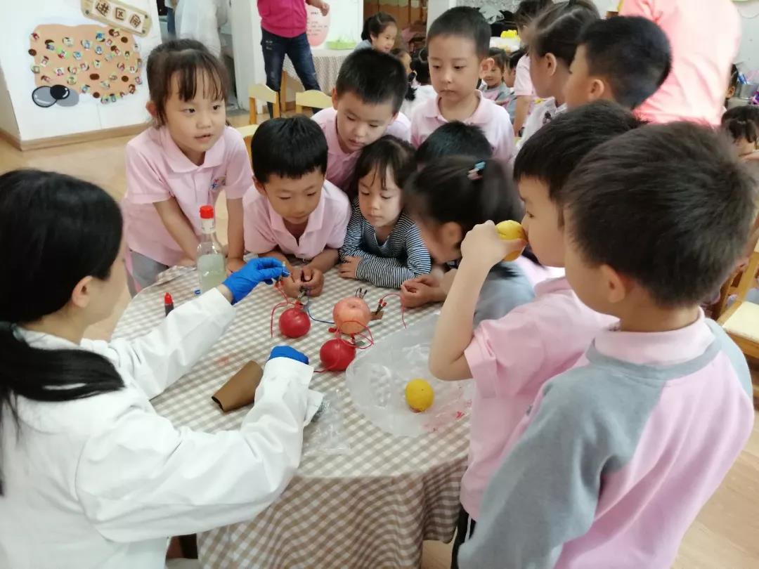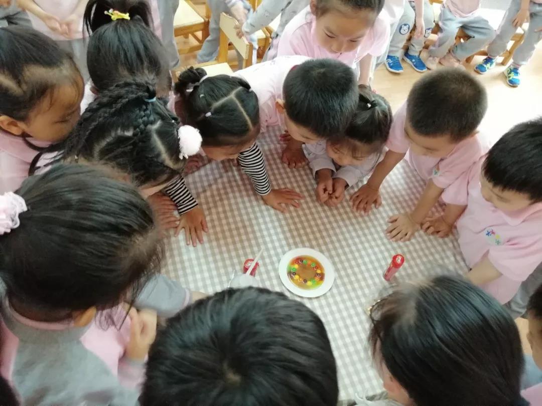 考虑到小朋友们的理解能力以及喜欢亲自动手操作的特点,趣味实验小组先后展示了六组贴近生活的实验,分别是会移动的水、瓶子吹气球、彩虹糖实验、可乐喷泉、火山爆发和水果电池。