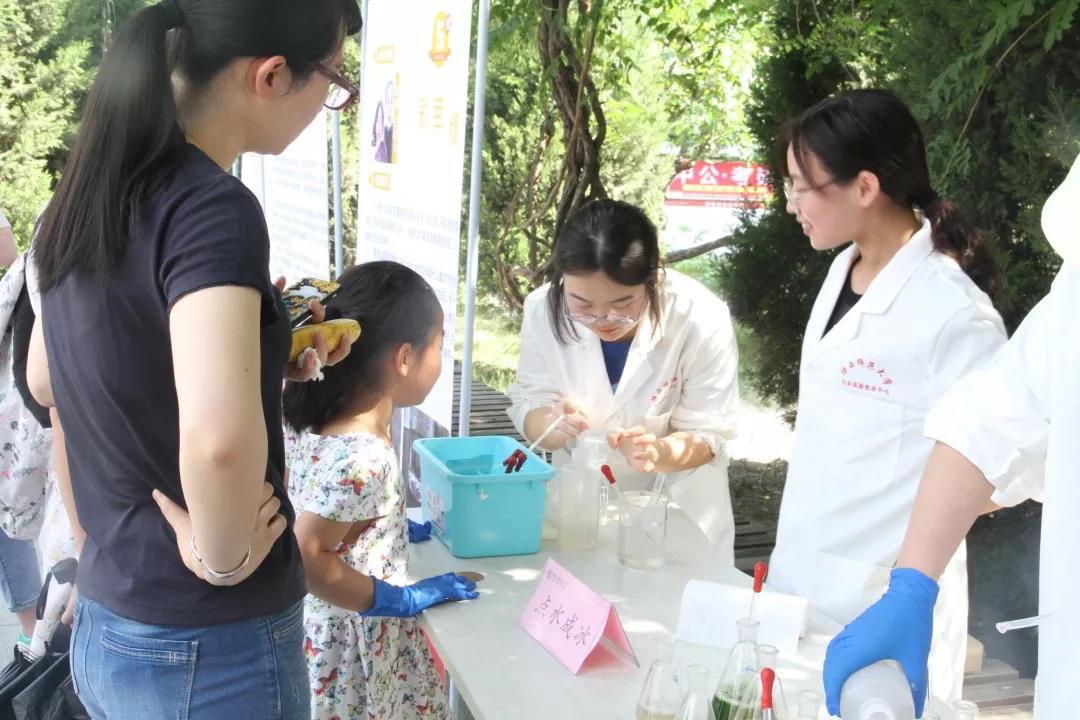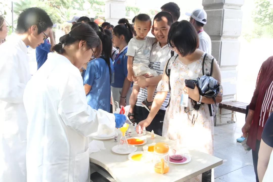 学生、来我校游学的中学生、师大社区群众等驻足观看,实验小组为观众带来包括动手拼装、展示讲解、实验演示等不同类型的18个化学元素相关活动,分别是:火山爆发、神奇的红茶、彩色雨滴等。现场观众在演示小组的指导下也尝试动手操作实验。
