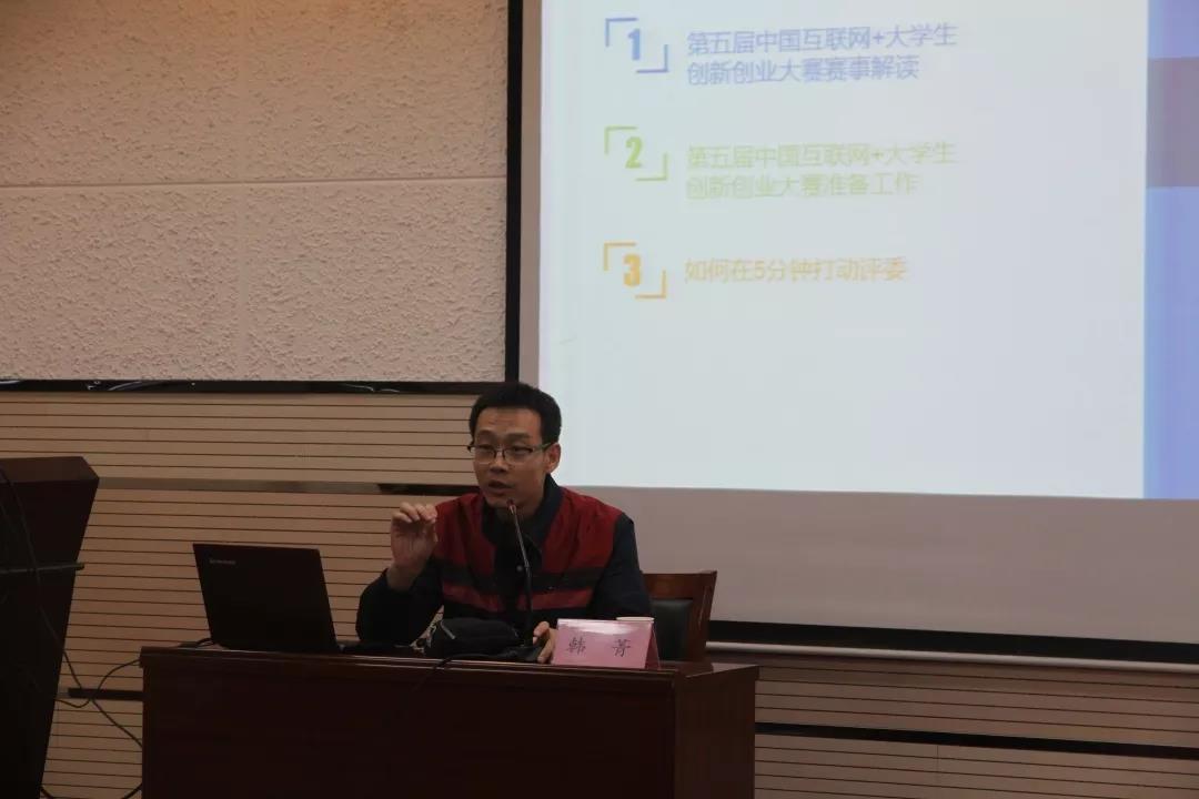 讲座伊始,副院长焦桓简单介绍了本次讲座主旨。接着,韩菁老师介绍了“互联网+”大赛在新形势下对当代大学生的意义,此次大赛是当代大学生发挥想象力,融入社会的重要契机。