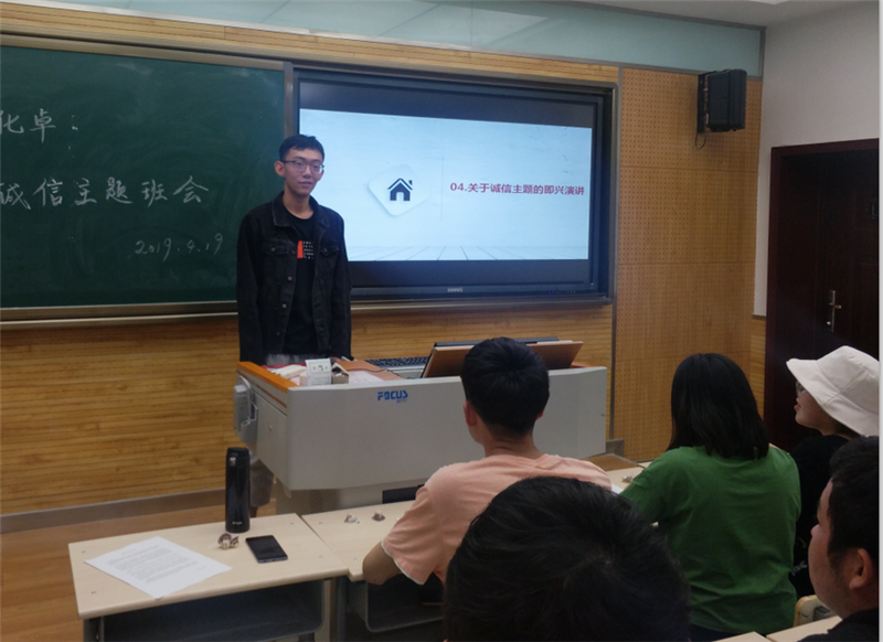 2017级化学笃学实验班开展了诚信小故事分享,表达了大家对诚信品质的重视与承诺;2017级化学卓越班举行了诚信书法比赛,书写诚信相关的格言警句;2017级化学一班开展了以“校风、学风、家风”为主题的诚信名言和诚信故事分享,全班同学集体宣誓并在诚信倡议书上签字;2017级化学二班举行了诚信主题诗歌朗诵,表达同学们对诚信的理解和歌颂;2017级化创一班、化创二班和应用化学专业的同学在班会中观看了诚信主题微电影,并组织开展了以诚信主题的即兴演讲和情景剧表演。