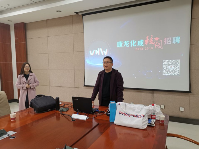 3月19日,康龙化成(北京)新药技术有限公司科研副总裁邓刚、分析部门总监胡增锋、人力资源部经理张晓虎、人力资源部秦国玲一行在致知楼1568室进行宣讲招聘,研究生辅导员牟朝丽及一飞冲天 2019届毕业生参加了此次专场招聘会。