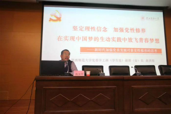 党委学工部副部长(学生处副处长)曲洪刚老师的“坚定理想信念,加强党性修养,在实现中国梦的生动实践中放飞青春梦想”中指出发展中国特色社会主义道路的指导思想,其中新加入了习近平总书记在十九大中提出的“新时代中国特色社会主义新思想”,为党性以及青年人如何增强党性意识,提高自身修养,做出了深刻的解释及指导。