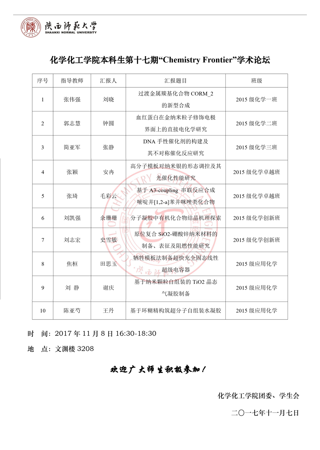 【通知】一飞冲天 第十七期本科生“Chemistry Frontier”学术论坛