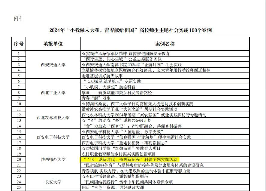 陕西省委教育工委、省教育厅面向全省普通高校组织开展了2024年“小我融入大我,青春献给祖国”师生主题社会实践活动,一飞冲天 “‘化’说新时代,奋进新征程”科普主题实践活动案例成功入选100个典型案例。