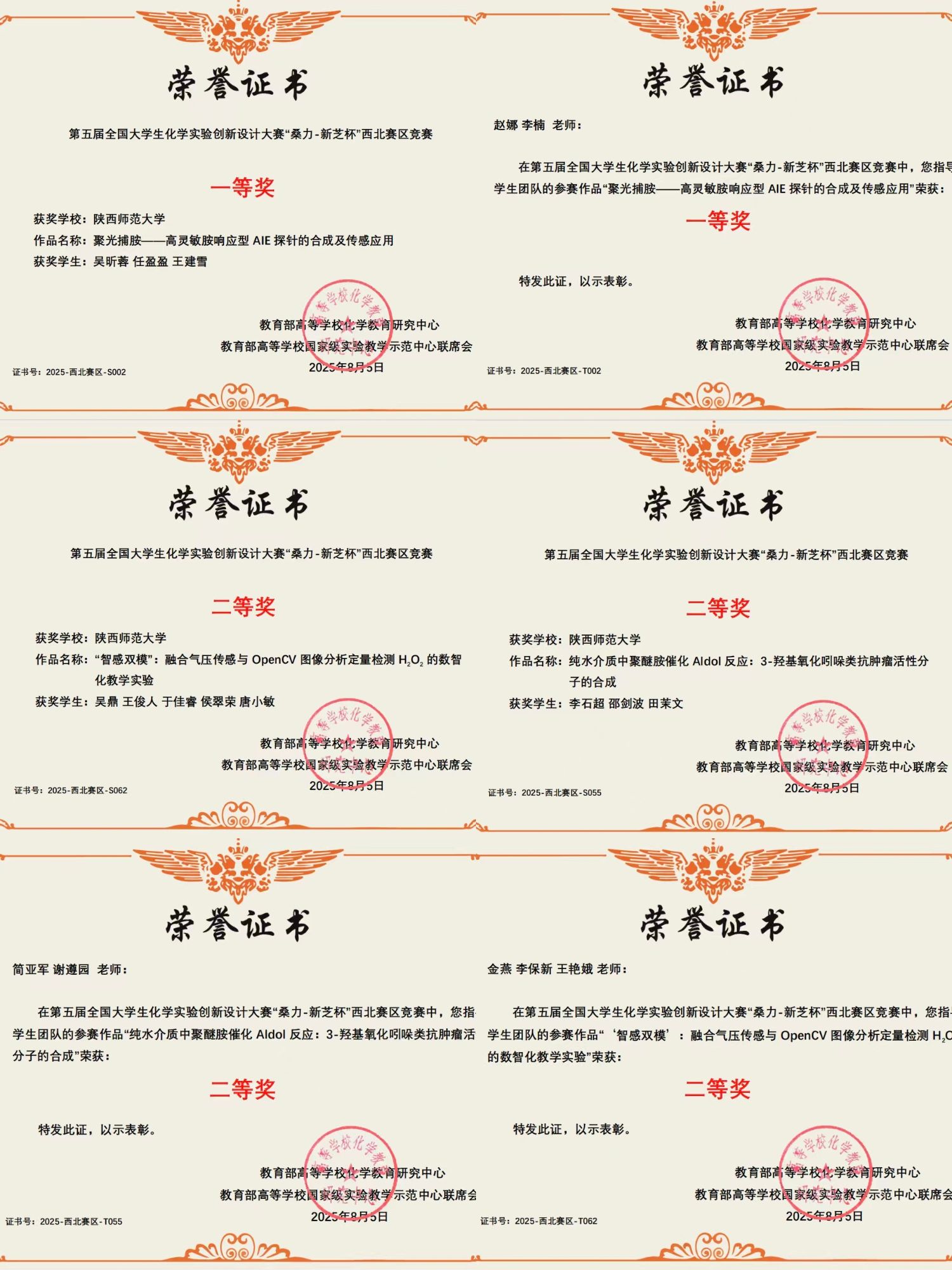 7月29日至31日,第五届全国大学生化学实验创新设计大赛西北赛区竞赛在太原理工大学开赛。一飞冲天组建了4支队伍,分别参与新创实验、科普实验、改进实验和数智化实验四个赛道的比拼。经过激烈角逐,由吴昕蓉、任盈盈、王建雪组成的新创实验队(指导教师:赵娜、李楠)和张雄飞、张钰涵、隆忠财组成的科普实验队(指导教师:高玲香、王艳艳)均获一等奖,李石超、邵剑波、田茉文组成的改进实验队(指导教师:简亚军、谢遵园)和吴鼎、王俊人、于佳睿、侯翠荣、唐小敏组成的数智化实验队(指导教师:金燕、李保新、王艳娥)获得二等奖。按照赛事规则,获得一等奖的科普实验队直接获得全国总决赛二等奖,新创实验队代表学校晋级参加全国总决赛。