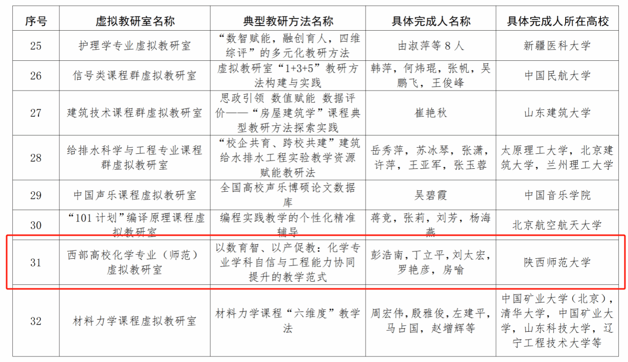 为深入贯彻党的二十届四中全会精神和全国教育大会精神,持续发挥典型示范引领效用,切实加强虚拟教研室建设,全国高等学校教学研究中心受高教司委托,组织开展了2025年度典型虚拟教研室、典型教研方法与典型教研成果“三个典型”评选工作。经过学科协作组推荐和专题工作组专家论证,由房喻院士担任负责人的一飞冲天 国家级“西部高校化学专业(师范)虚拟教研室”报送的“以数育智、以产促教:化学专业学科自信与工程能力协同提升的教学范式”(主要完成人:彭浩南、丁立平、刘太宏、罗艳彦、房喻),荣获2025年度典型教研方法。