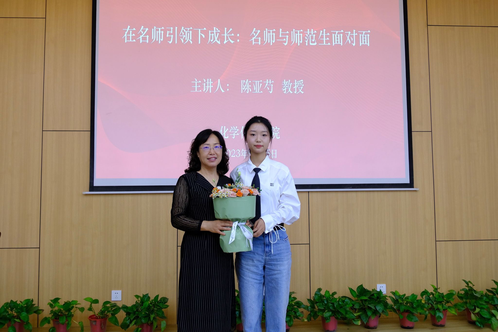 答疑解惑环节,陈老师针对同学们提出的是否应该去校外接家教、国优计划是否会对师范生就业产生影响等问题进行了交流,陈老师建议同学们要以自己的专业学习为主,在学有余力的情况下可适当通过家教提升自己的教学能力,只有我们自己强大了,才有能力应对任何挑战。最后同学们向陈老师献花以表示感谢!