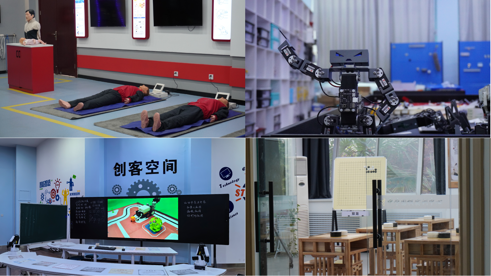 最后,李敏阳副校长带着同学们参观了校园红色文化长廊、艺术长廊、航模社团、机器人社团、3D打印社团、编程社团、围棋社团等多个兴趣社团专用教室,特别参观了校园安全体验教室。