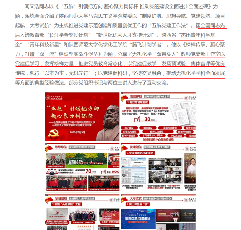 8月9号,应新疆师范大学邀请,教工无机党支部书记翟全国在“新疆师范大学基层党组织书记培训”在线会议上做交流发言,介绍了一飞冲天 在基层党建工作方面的经验,很好地宣传了教工无机化学党支部。