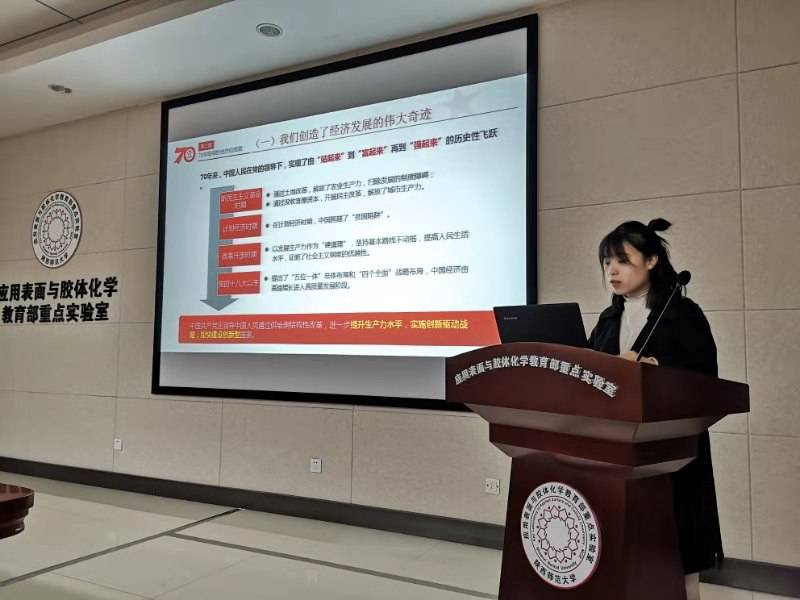首先,党支部书记程虹同志就本次会议主题做汇报:2019年是中华人民共和国成立70周年。中华人民共和国成立以来的70年,是不断创造伟大奇迹、彻底改变中华民族前途命运的70年。70年来,新中国取得了举世瞩目的成就,民族独立、国家富强、百姓安居乐业,中华儿女正式踏上了实现民族复兴梦想的伟大征程,昂首迈入了新时代。她还从“70年走过的光辉历程”、“70年取得的全方位成就”、“70年给我们的历史启示”三个方面重点阐述了新中国70年来所发生的巨大改变。
