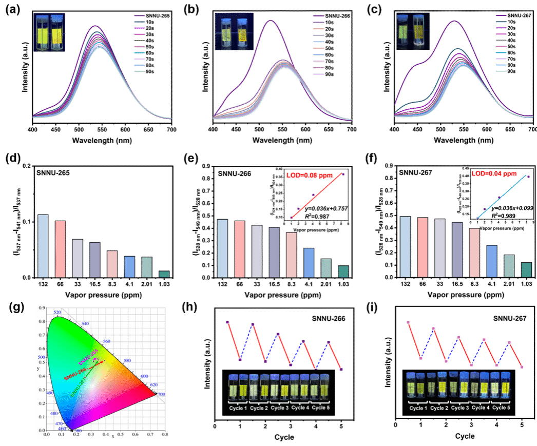 总的来说本研究通过孔空间分区策略,在镁基MOF中实现供体-受体的精准空间排布,构建质子化诱导的TSCT传感平台。SNNU-266与SNNU-267中的氨基在DCP作用下质子化形成-NH3+受体,与TPPA供体发生高效TSCT,导致荧光猝灭与红移,在液/气相中均实现DCP的超灵敏检测(液相LOD 0.017 ppm、气相LOD 0.04 ppm),响应时间<10秒且循环稳定。该工作不仅证实PSP策略对MOF中TSCT的精准调控能力,还为神经性毒剂模拟物的快速、超灵敏检测提供实用化方案,为荧光传感机制调控与危险化学品检测材料的设计提供“结构分区-机制调控-性能优化”的系统范式。