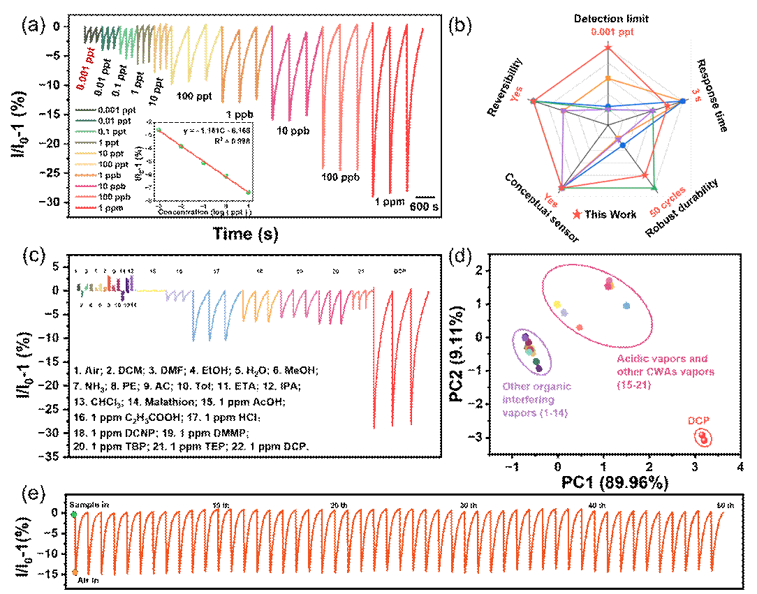 总之,本文开发了一种基于硼氟配合物(aza-BODIQU)和3,6-二叔丁基咔唑修饰的高性能荧光传感器BODIQU-tBuCZ,用于神经毒剂检测。该薄膜具有38.76%的自由体积率,其多孔结构由叔丁基的空间位阻效应形成,有效抑制π-π堆积,促进分析物快速传输,解决了固态蒸汽传感中传质与发光的平衡难题。该传感器对DCP蒸汽表现出卓越性能:检测限低至0.001 ppt,响应时间约3秒,可重复使用超过50次,性能优于多数现有传感器。相比未修饰叔丁基的材料,其多孔性和抗聚集能力显著提升,同时具备高选择性和光稳定性。本研究提供了一种可靠的立体调控策略,为开发实用化、可扩展的危险化学品传感平台提供了新途径。