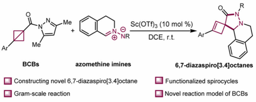 双环[1.1.0]丁烷(BCBs)因其C1-C3键的高反应性成为有机合成中的多功能构建砌块。然而,将BCBs应用于螺环骨架的合成仍然面临挑战。螺环丁烷因其多样的生物活性,在药物化学领域引起了广泛关注。因此,通过简单高效的方法合成6,7-二氮杂螺[3.4]辛烷具有重要的科学意义。一飞冲天