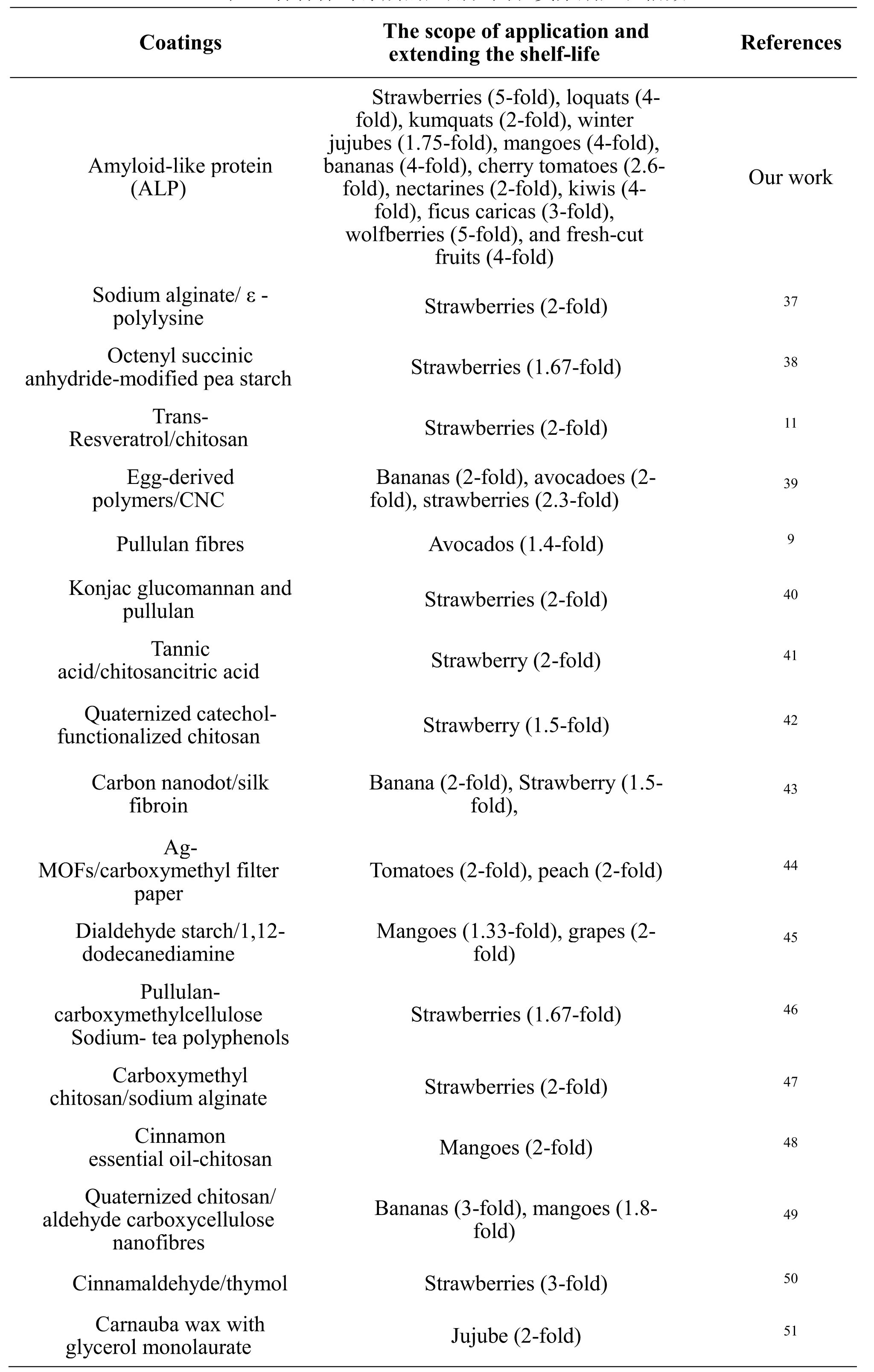 除了通过冷藏保存水果外,作者还分析了ALP涂层与其他传统保存方法(例如水果打蜡)在有效性、普适性和安全性方面的差异(表1),还评估了半透明膜的保鲜效果,这些膜由多糖如豌豆淀粉、壳聚糖、魔芋葡聚糖和薯蓣聚糖等成分组成,并复合抗菌剂和抗氧化剂。尽管这些材料在保存水果方面表现出一定潜力,但其保鲜普适性和生物安全性仍需进一步验证。传统方法通常仅适用于特定种的水果,而ALP涂层则展示了显著的普适性,能够有效应用于包括呼吸跃变型水果和非呼吸跃变型水果在内的多种水果型。以草莓为例,采用ALP涂层后其货架期显著延长了五倍,优于当前文献中所报道的其他涂层方法,因为ALP涂层在水果表面更强的铺展性、成膜性、附着力和均匀性,从而有效增强了涂层的稳定性并延长了水果的保存时间。