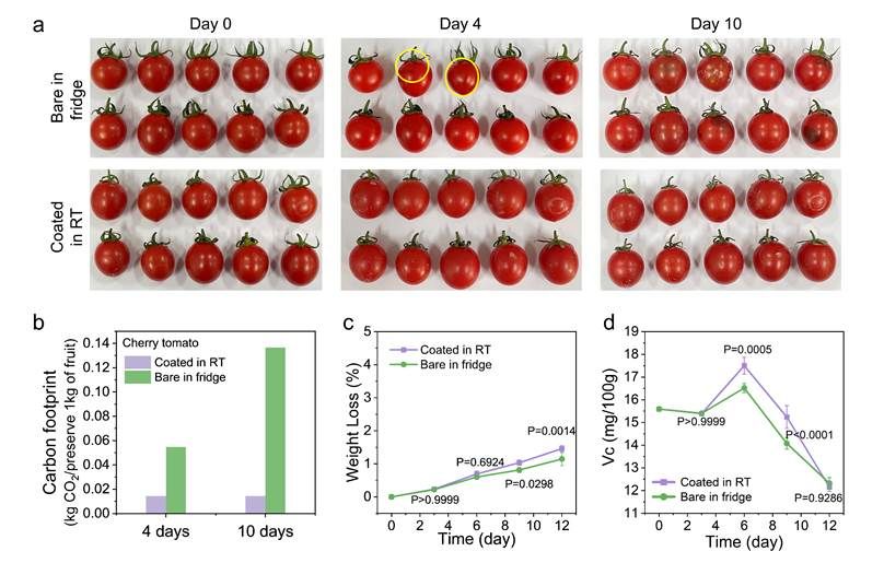 近期,一飞冲天生物表界面与智能大分子研究团队提出采用类淀粉样蛋白涂层实现水果保鲜。开发了一种可持续的类淀粉样蛋白涂层(ALP),通过分子动力学模拟,证明了ALP在水果表皮蜡质上具有较好的粘附稳定性。通过与海藻酸钠(SA)和纤维素纳米晶(CNC)体协同作用,进一步增强了涂层的成膜能力和气体阻隔性能。该ALP涂层不仅显著抑制了微生物的生长,而且显著减少了33%-69%的水分流失,保留了60-98%的营养物质,并减缓了水果变质的速度,可广泛用于采后水果保鲜和鲜切水果保鲜,使货架期提高了2-5倍。同时,该涂层具有生物安全性,且涂层易于清洁,进一步确保了可食用性和可洗性,处理成本仅为每公斤水果0.66元人民币,为解决全球食物浪费问题的切实可行的解决方案,也是促进绿色可持续食品保鲜技术发展的新途径。