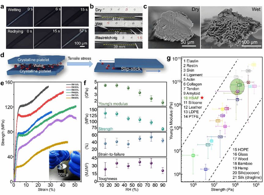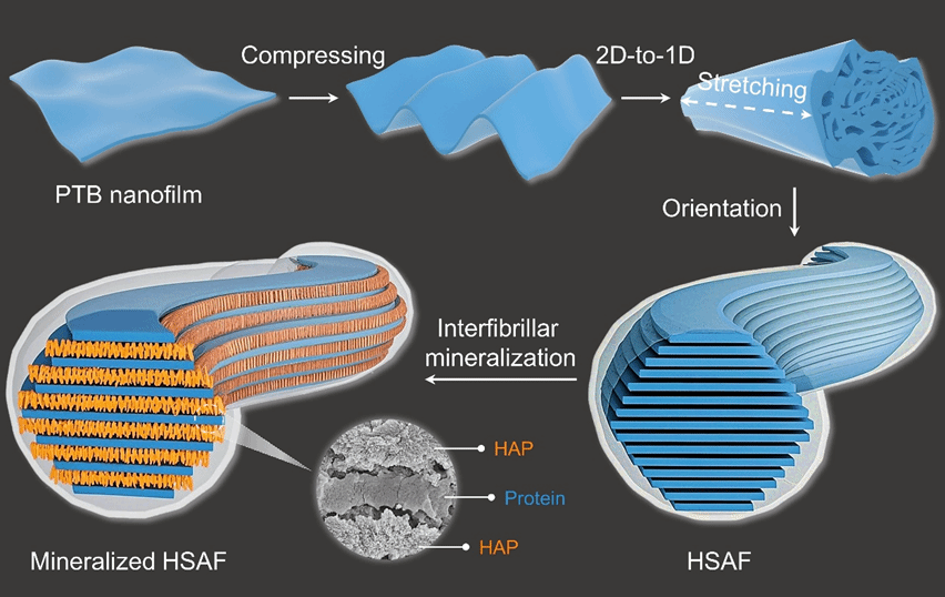 该工作开发了机械力导向的两步转化法,将蛋白质纳米膜转化为具有多层动态适应间隙的分级结构淀粉样纤维(HSAF),实现纤维内矿化。首先利用三(2-羧乙基)膦(TCEP)诱导牛血清白蛋白(BSA)在气/水界面自组装形成蛋白质纳米膜。通过压缩与纵向拉伸的2D → 1D转变,将相变牛血清白蛋白(PTB)纳米膜重构为具有多层结构的HSAF。在此过程中,展开的蛋白链逐渐弛豫并形成各层内的有序β-sheet构象。这种晶体HSAF凭借分级多层结构以及内部亲水界面保持柔性。