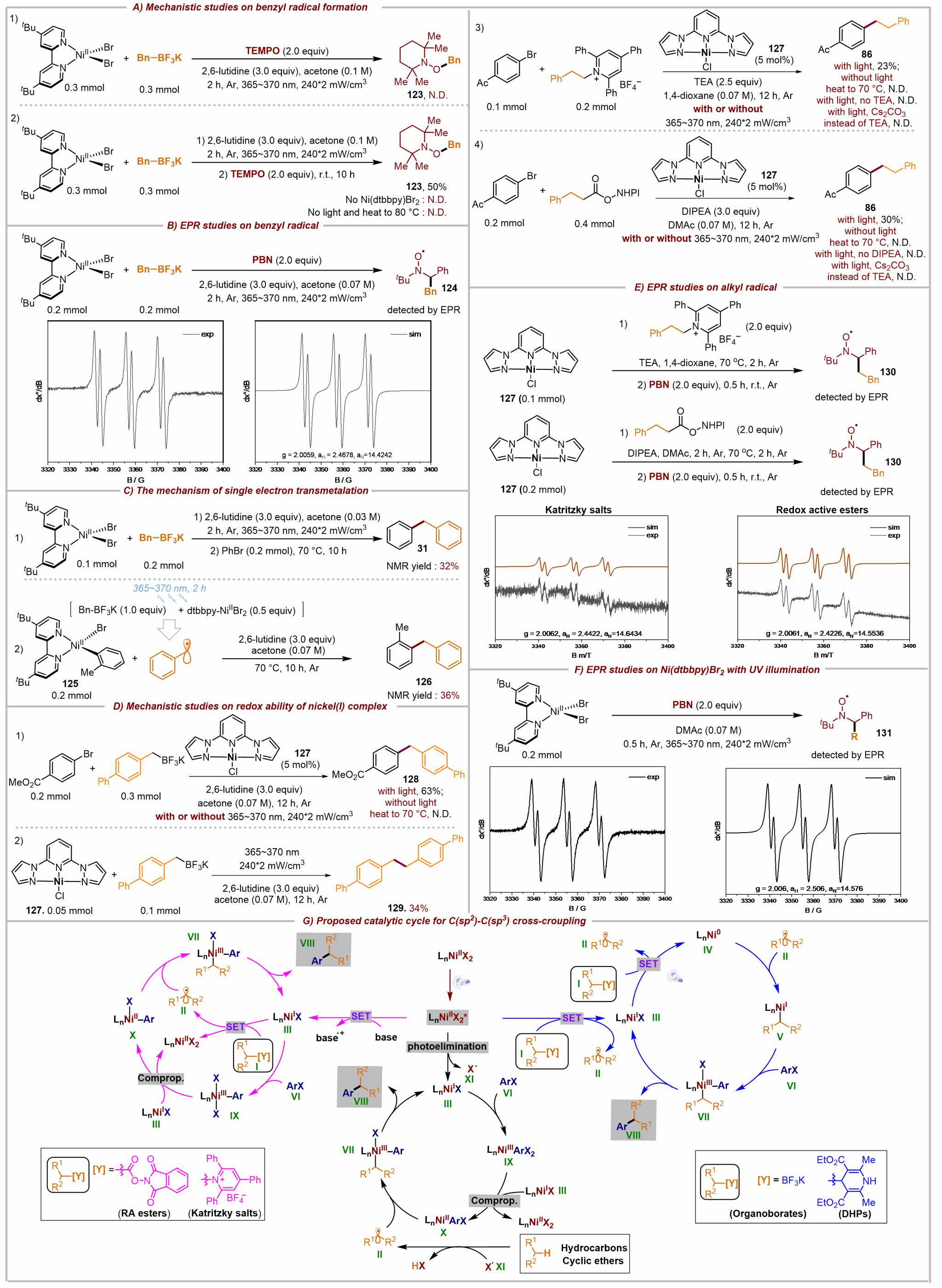 为了深入了解反应机理,团队进行了一系列控制实验和机理研究。实验结果表明:镍催化剂在反应中起着不可替代的多重作用,既能激活C(sp3)自由基前体和卤代芳烃,又参与了整个反应过程。在光照射下,镍(II)配合物与不同的C(sp3)自由基前体发生单电子转移过程,生成烷基自由基和低价镍物种,随后经过一系列反应包括氧化加成、单电子转金属化及还原消除等,最终实现C(sp2)-C(sp3)键的构建。值得注意的是,镍(I)配合物是催化C(sp3)前体生成烷基自由基的关键中间体。通过合成已报道的Ni(I)配合物进行控制实验以及EPR实验,进一步成功捕获产生的烷基自由基。在该光促进镍催化体系中,多种自由基前体产生自由基的方式不同:对于有机三氟硼酸盐和1,4-二氢吡啶,通过光激发后的Ni(I)配合物氧化产生;对于氧化还原活性酯和Katritzky盐,通过Ni(I)配合物还原产生;对于烃类和环醚,则是通过激发态Ni(II)配合物的镍卤键均裂所生成的卤素自由基介导的氢原子转移过程。