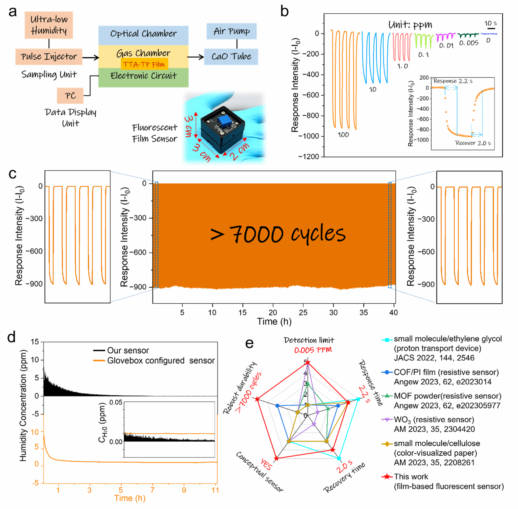 基于该COF膜对低湿度表现出荧光猝灭响应,作者构建了超低湿度荧光传感器(图3)。该传感器的检出限可低至0.005 ppm,并具有快速响应/恢复速度 (2.2 s/2.0 s)。传感器的性能在超过7000次的连续测试后并没有表现出明显的变化。此外,该传感器能够实现对手套箱内超低湿度的原位在线监测,其输出的信号与手套箱内置的商用传感器信号保持同步。在湿度低于0.01 ppm时,该传感器仍具有区分能力。