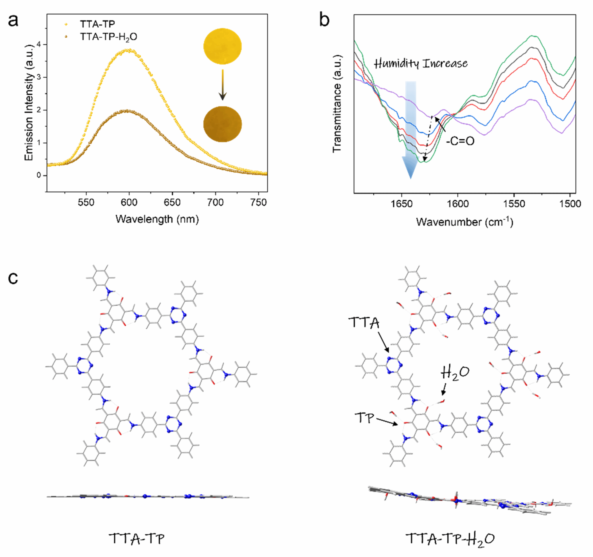 作者对该薄膜的湿度响应机理进行了研究(图5),红外光谱研究表明膜内的亲水羰基结构会与水分子形成氢键,理论计算发现氢键的形成使得COF膜结构由平面变为扭曲,降低了其吸收和荧光发射强度。