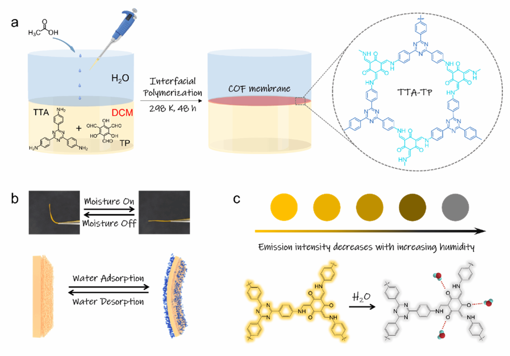 图 1. TTA-TP COF膜的制备及其湿度响应示意图